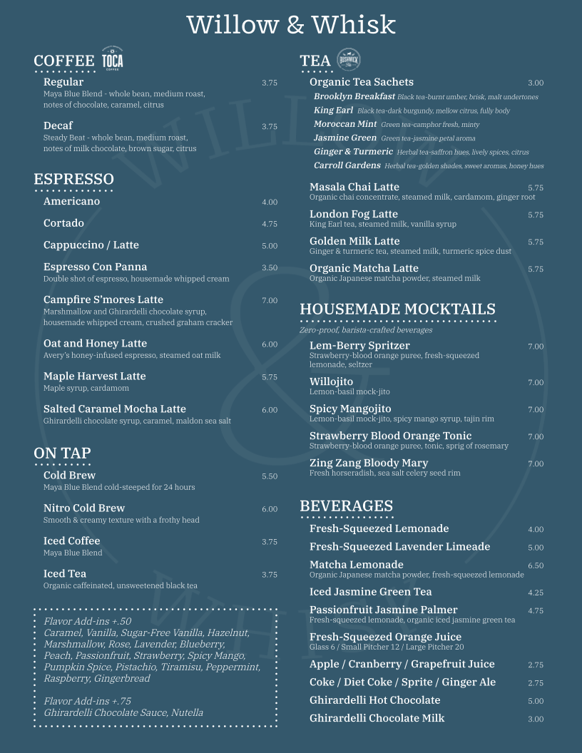 Brooklyn Breakfast Black tea-burnt umber, brisk, malt undertones King Earl Black tea-dark burgundy, mellow citrus, fully body Moroccan Mint Green tea-camphor fresh, minty Jasmine Green Green tea-jasmine petal aroma Ginger & Turmeric Herbal tea-saffron hues, lively spices, citrus Carroll Gardens Herbal tea-golden shades, sweet aromas, honey hues